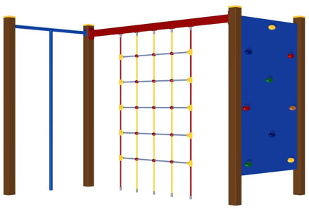 Celokovová šplhací sestava s výlezovými tyčemi, kolmou lezeckou stěnou s horolezeckými chyty, šplhací tyčí, kruhy, hrazdou, kolmou lezeckou stěnou s otvory a kolmou lezeckou sítí.