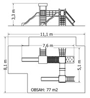 Herní sestava je vyrobena z konstrukční oceli (na přání zákazníka z nerezové oceli). Konstrukci tvoří čtercové profily o rozměru 100x100 mm, které jsou ukotvené do betonových patek. Konstrukce je opatřena zinkovým základem a následně vypalovanou barvou KOMAXIT v odstínu RAL. Podesta, zábradlí, nášlapy a lezecká stěna jsou vyrobeny z vysoceodolného polyetylenu (plastu HDPE). Lezecká síť a lanový most jsou vyrobeny z polypropylenových lan s ocelovým jádrem. Skluzavky, tunel a střecha jsou laminátové. Spojovací materiál je pozinkovaný nebo nerezový.