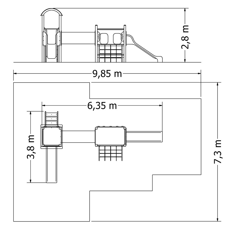 Herní sestava je vyrobena z konstrukční oceli (na přání zákazníka z nerezové oceli). Konstrukci tvoří čtercové profily o rozměru 100x100 mm, které jsou ukotvené do betonových patek. Konstrukce je opatřena žárovým zinkováním a následně vypalovanou barvou KOMAXIT v odstínu RAL. Podesty, střecha, zábradlí a lezecká stěna jsou vyrobeny z vysoce odolného polyetylenu (plastu HDPE). Lezecká síť je vyrobena z polypropylenových lan s ocelovým jádrem. Skluzavky a tunel jsou laminátové. Spojovací materiál je pozinkovaný nebo nerezový.